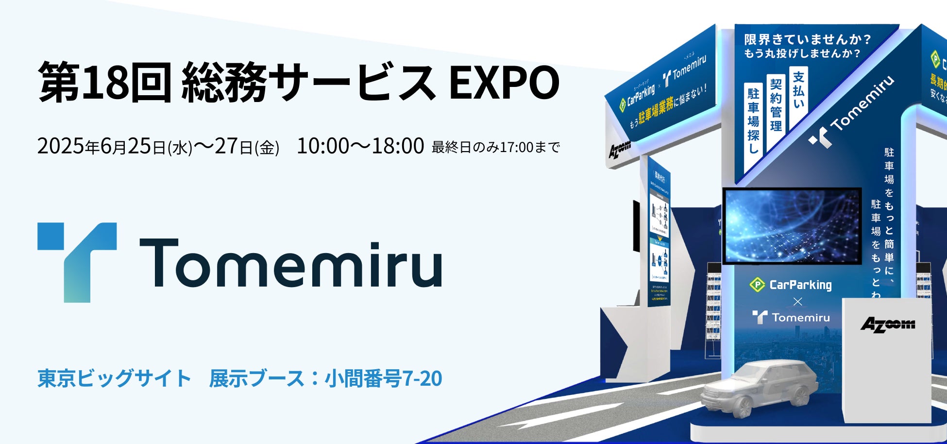 株式会社アズーム(本社:東京都渋谷区代々木、代表取締役社長:菅田洋司)は、2025年6月25日(水)~27日(金)に東京ビッグサイトにて開催される「第23回【東京】総務・人事・経理Week[春]」内、「第18回 総務サービスEXPO」に社用車駐車場管理サービス「Tomemiru」を出展いたします。