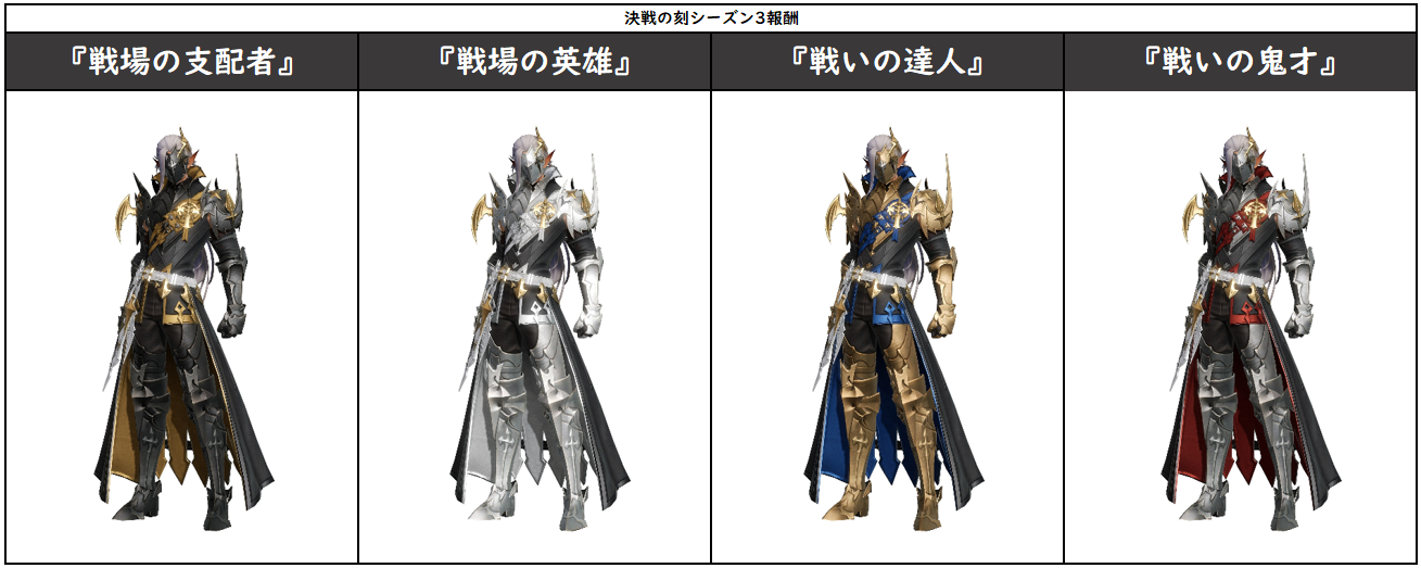 シーズン3ではアリーナでの上位入賞で「戦場の英雄」「戦場の支配者」など、カルトの特別な衣装を手に入れることができます。ぜひ、上位入賞を目指して頑張ってください!