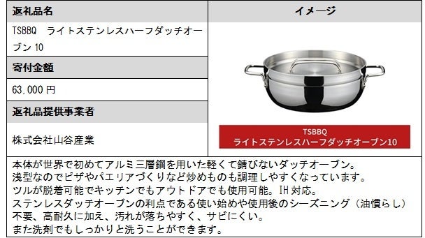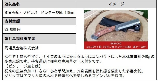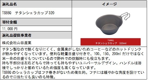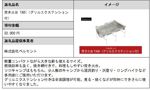 また、「株式会社ベルモント」が6月に新規事業者として参入し、「焚き火台 TABI(グリルエクステンション付)」など11品の返礼品を掲載しています。