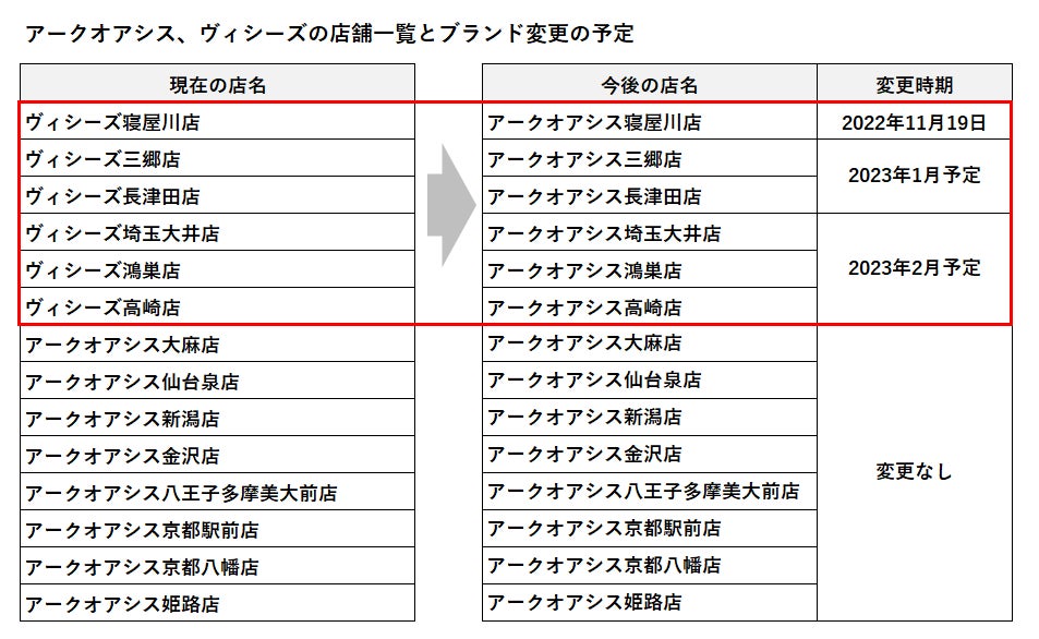 2022年11月19日(土)より「ヴィシーズ寝屋川店」は「アークオアシス寝屋川店」にリニューアルします。
