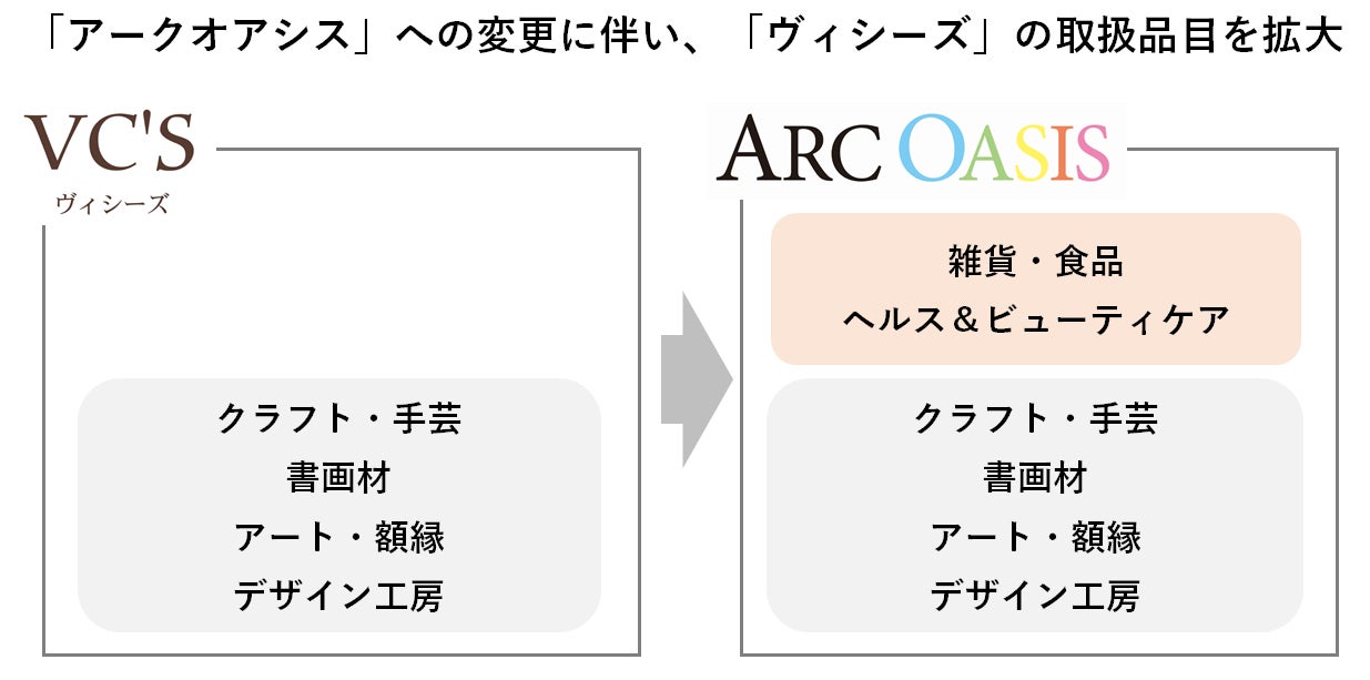 アークランズ株式会社(社長:坂本晴彦、新潟県三条市)は当社が運営するアート&クラフト専門店「ヴィシーズ」全6店舗のブランドを趣味の大型専門店「アークオアシス」に統合することをお知らせいたします。「ヴィシーズ」のブランド変更により「アークオアシス」は現在展開する8店舗と合せて14店舗となります。