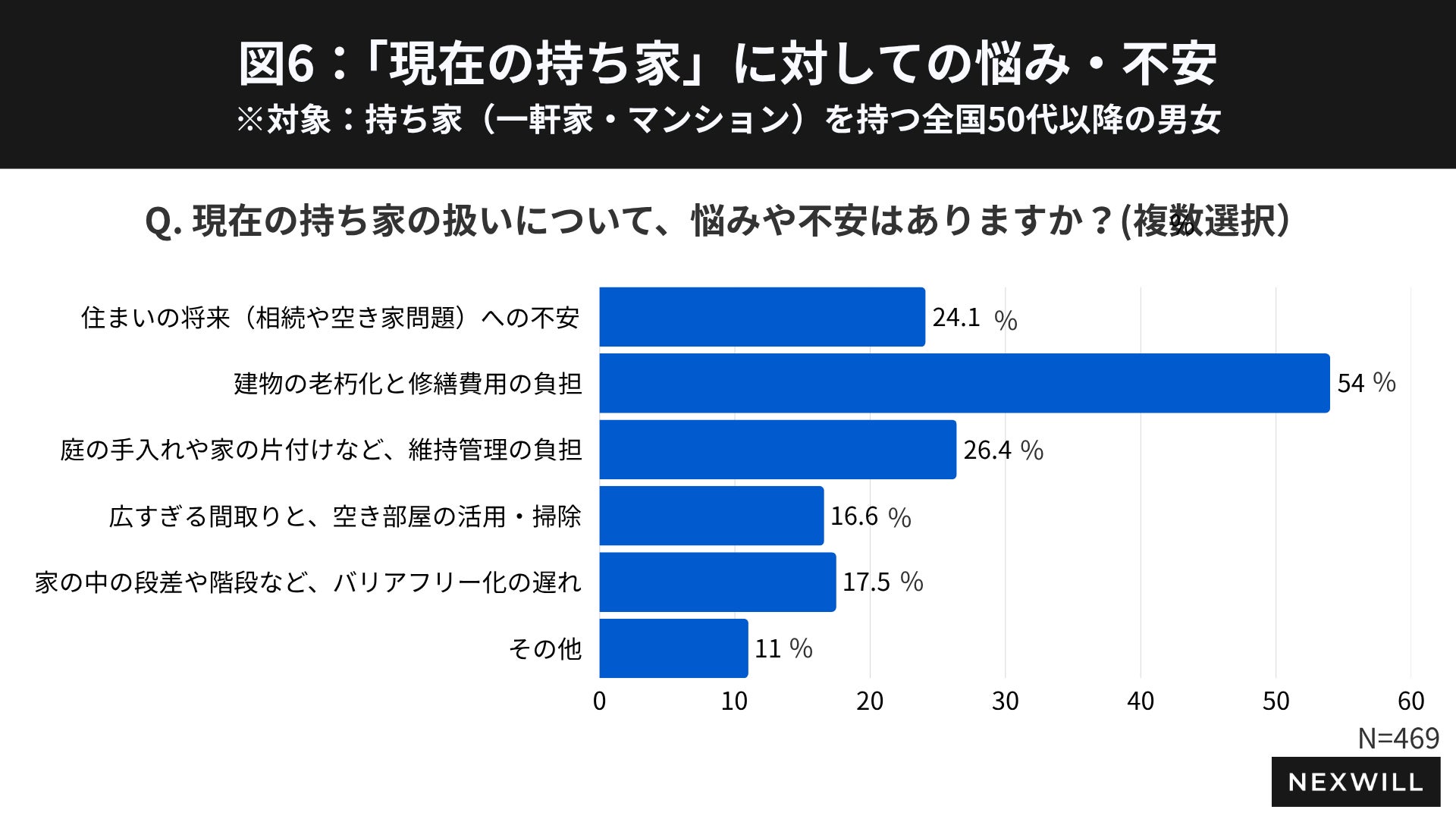 移住・住み替えを検討する上での不安・悩みについて尋ねたところ、「大きな不安や悩みがある」「不安や悩みがある」が全体の約7割と、移住・住み替えに不安を抱える50代以降の持ち家所有者が多くいることが明らかになりました(図4)。特に、「建物の老朽化と修繕費用の負担」(54.0%)といった悩みが最も多く、「庭の手入れや家の片付けなど、維持管理の負担(26.4%)、「住まいの将来(相続や空き家問題)への不安」(24.1%)と続き、費用面・管理面・将来への不安といった複数の課題が重なっている実態が明らかになりました(図5)。