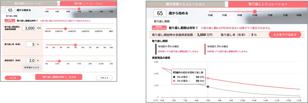 セゾン投信に口座をお持ちのお客さまが、運用資産の取り崩し方法において選択肢を増やし、“運用しながら使う”ことで生涯投資を継続いただけるようサポートいたします。具体的なイメージを持っていただくため、資産形成・定期換金についてシミュレーションもご利用いただけます。