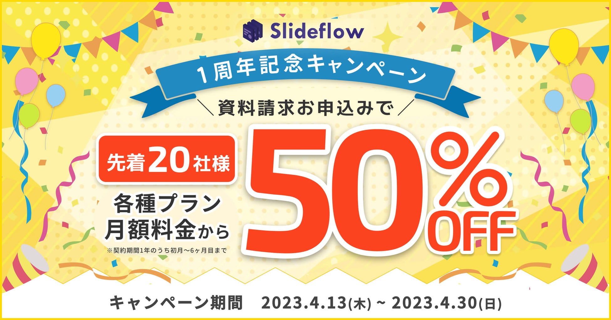 ~2023年4月13日(木)~4月30日(日)のキャンペーン期間中、Slideflow資料請求をお申込みいただいた先着20社様に各種プラン月額料金を50%オフで提供~