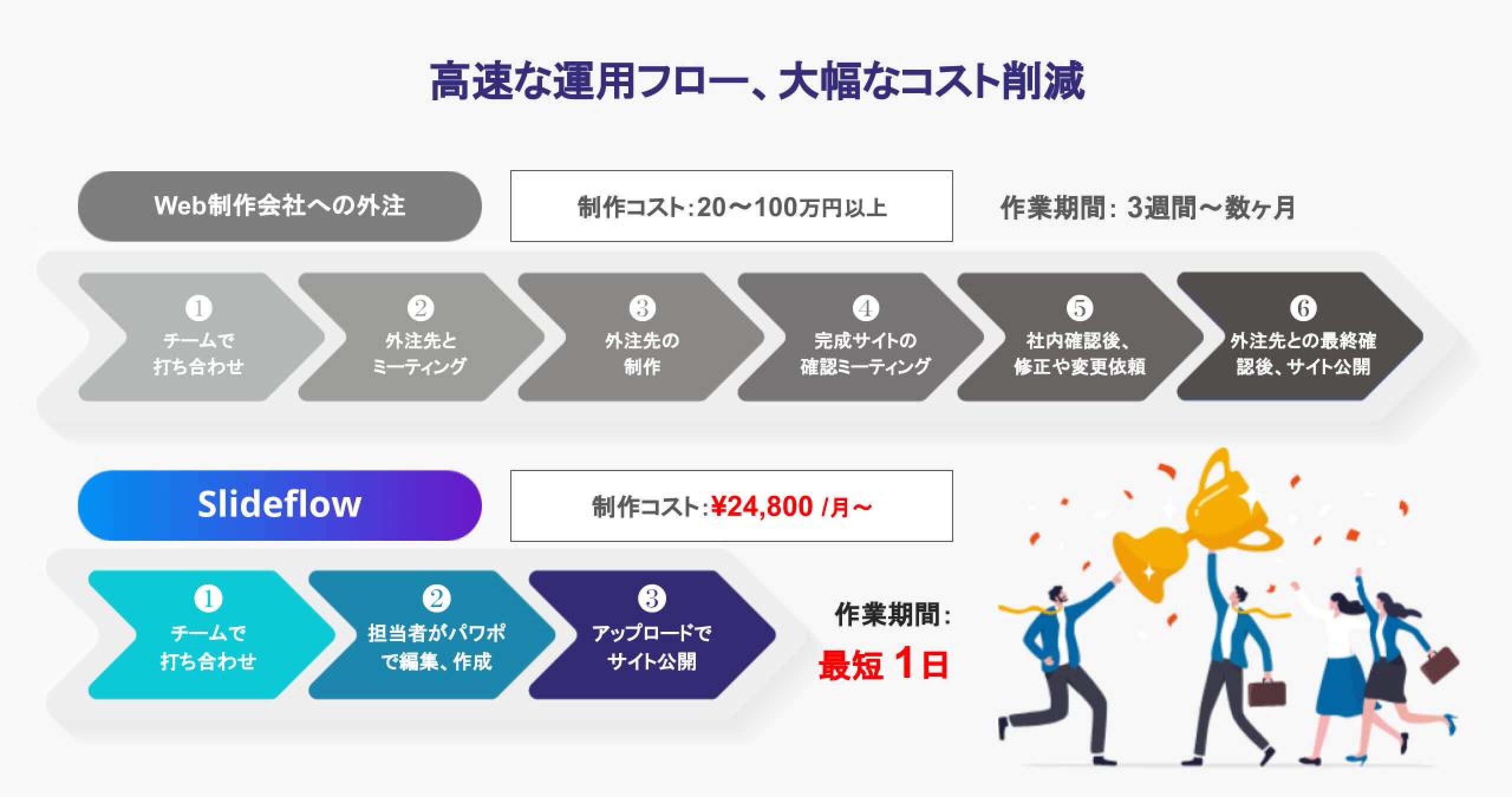 Webサイトを作成するには、多くの時間と費用がかかります。通常の制作フローでは、以下のような問題があります。Slideflowを導入することでこれらの問題が解決します。