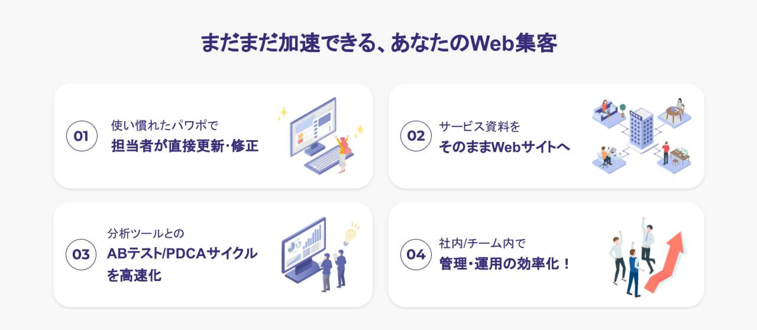 多くの方が利用する「PowerPoint」や「Googleスライド」をWebサイトの管理画面にすることで、社内やチーム内でのサイト制作・管理を可能としました。GoogleアナリティクスやGoogleオプティマイズと連携することで、Webサイトの最適化や分析も行えるため、運用コスト削減も実現できるサービスです。