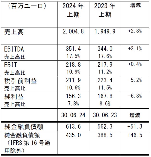 · 売上高 2,004.8 百万ユーロ、2023年上期比2.8%増(前年同時期の為替レート基準で3.3%増)