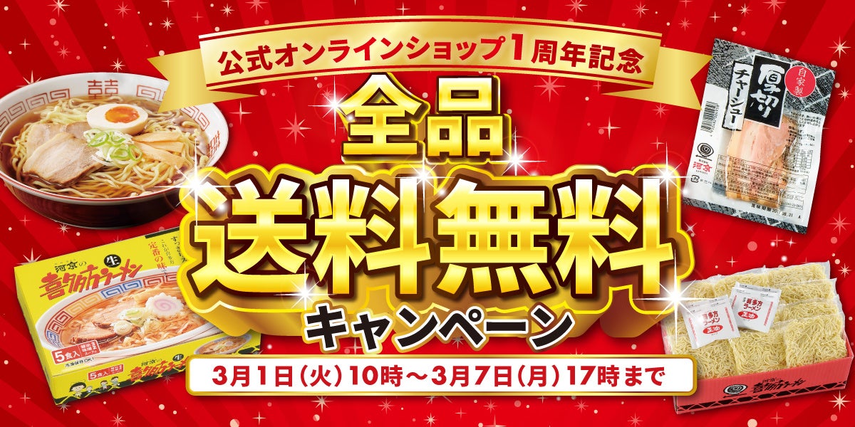 喜多方ラーメンの河京《河京公式オンラインショップ1周年》「全商品送料無料キャンペーン」開催!