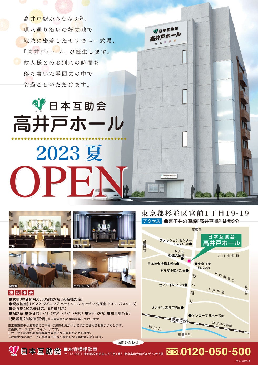 株式会社あいプラン(北海道札幌市/代表取締役・新道喜信)の日本互助会 高井戸ホール(東京都杉並区)が、2023年夏にオープンいたします。高井戸駅から徒歩9分のアクセスのよいエリアに、3つの式場とゆったりと過ごせる充実の設備を備えたセレモニー式場です。大切なお別れの時間を、落ち着いた雰囲気の中でおすごしいただけます。