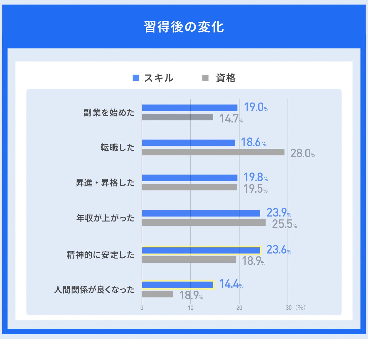 資格取得者は「転職した」が28.0%と最も多かった一方、スキル習得者では「副業を始めた」「精神的に安定した」「人間関係が良くなった」といったQOL向上に関する変化が多く見られました。