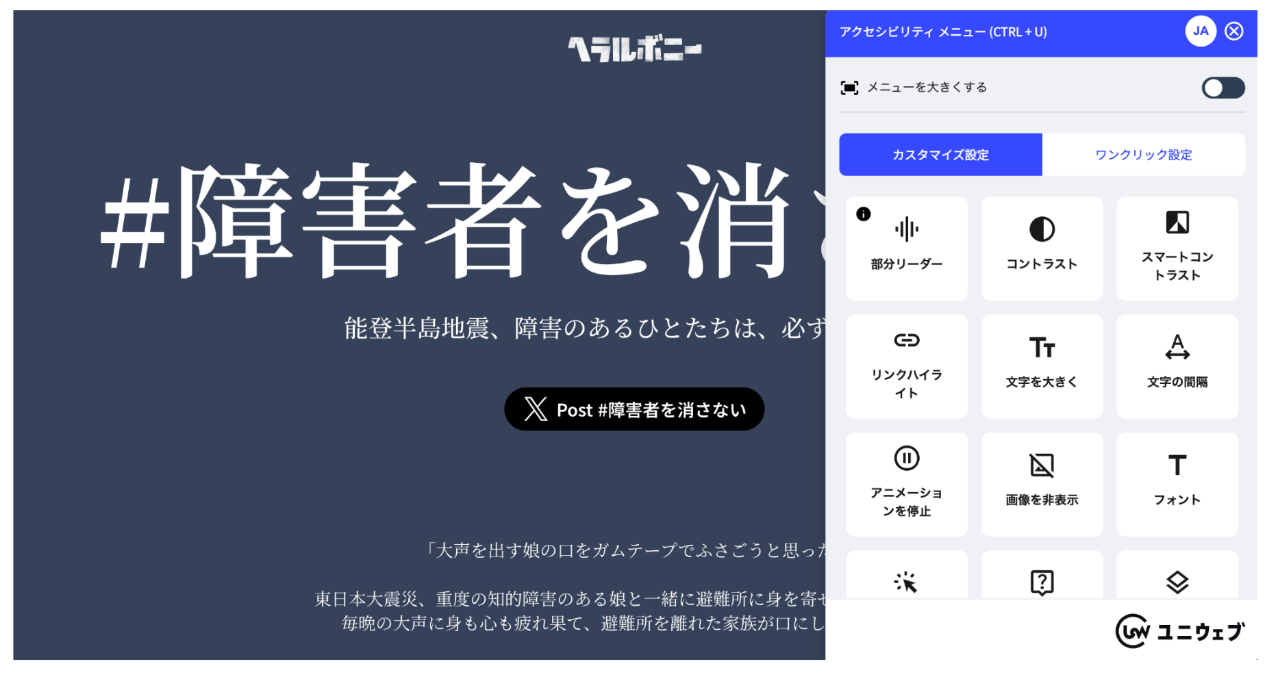 右下にユニウェブのアイコンが設置されました。アイコンをクリックすると、アクセシビリティメニューが表示されます。