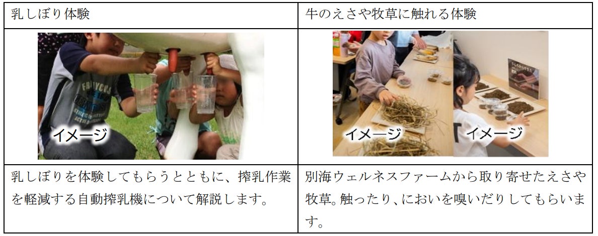 さらに、乳しぼりや牛のえさ・牧草に触れる体験、牛の大きさを体感するパネルの展示、食品包材をリサイクルした椅子等の展示、有機循環型酪農を学ぶシールラリーなど、子どもから大人まで楽しめる体験プログラムを複数用意し、SDGsと酪農について理解を深める機会を提供します。