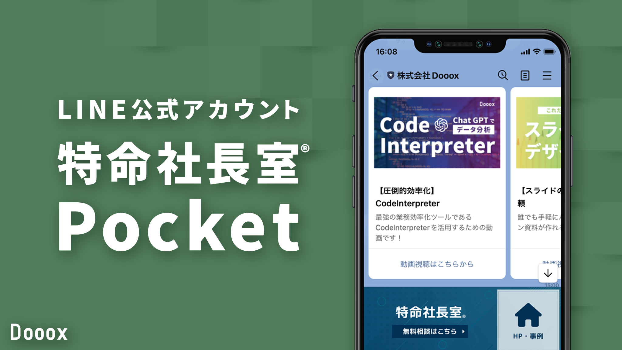 特命社長室®はこれまで、停滞案件の推進/活性化、新たなアイデアの実現、業務の仕組み作り、企業買収後の組織カルチャーと事業の統合など、多岐の領域にわたって経営者や新規プロジェクトの責任者に伴走してまいりました。企業経営における情報の速度と質が求められる中で、これまでのメールやウェブサイトを通じた情報提供手法に加え、より即時性と相互のコミュニケーション頻度を高めていくために、Dooox LINE公式アカウント『特命社長室®Pocket』を開設しました。