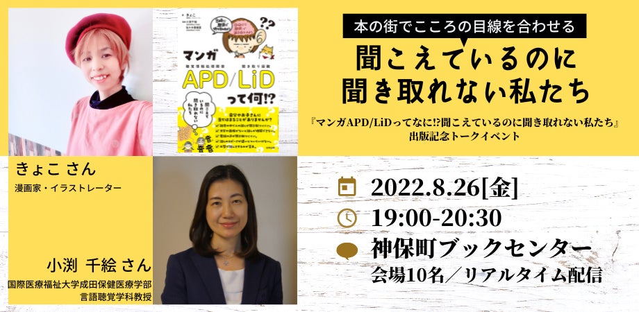 聞こえているのに聞き取れない、APD(聴覚情報処理障害)、LiD(聞き取り困難)。その当事者の目線から描かれた初のコミックエッセイ『マンガ APD/LiDって何!? 』が8/22に発売されます。APD/LiDとはどんな症状なのか、当事者が困っていることやその対策について、著者のきょこさんと、APD/LiD研究の第一人者小渕先生にお話し頂きます。音の洪水に生きる聞き取りぶきっちょさんとまわりの人ができること、その目線合わせの可能性を探ります。