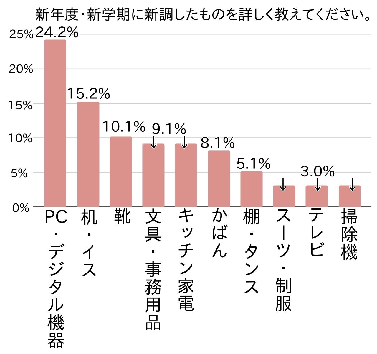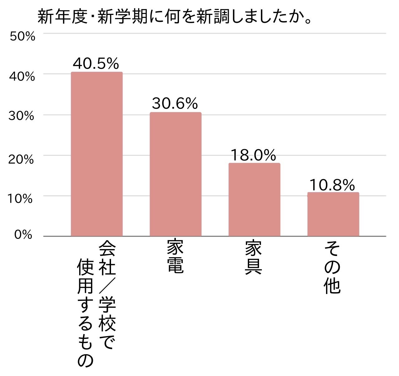 日々使う身の回りのものを気分一新して新調する方も多いようです。仕事や学校で毎日使う「靴(19.1%)」「文具・事務用品(9.1%)」「かばん(8.1%)」「スーツ・制服(3.0%)」等の意見が集まりました。