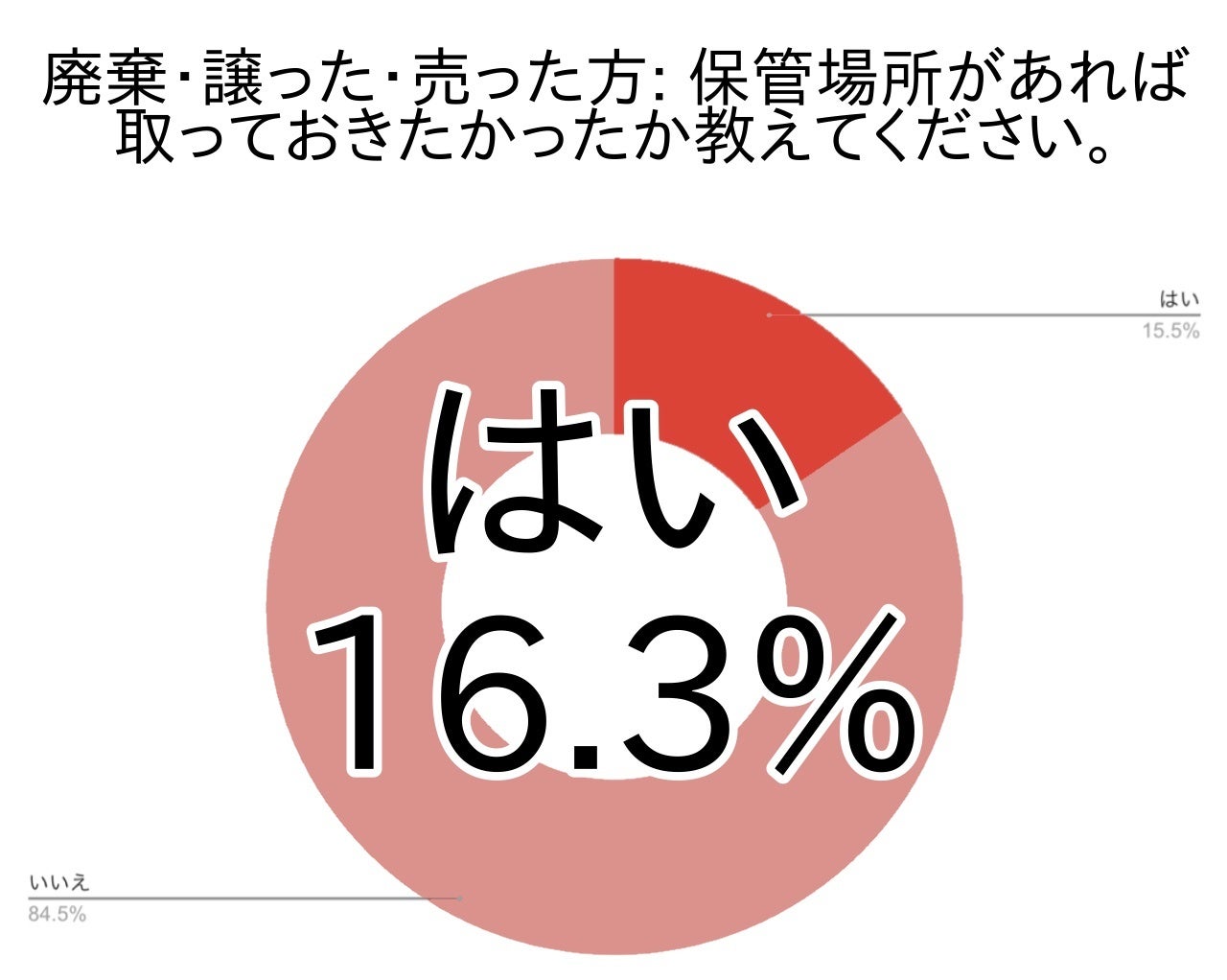 荷物保管において自宅スペース・収納スペースの制限によって保管場所に困るという状況が浮かび上がりました。そこでアンケートでは、廃棄・譲った・売った方に、もし保管場所が十分にあった場合、自宅に取っておきたかったかを尋ねました。