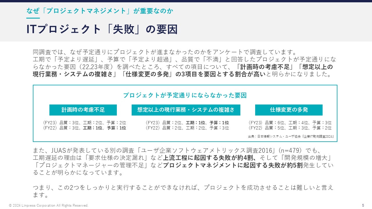 とある調査によると、工期遅延の理由は「要求仕様の決定漏れ」など上流工程に起因する失敗が約4割、そして「開発規模の増大」「プロジェクトマネージャーの管理不足」などプロジェクトマネジメントに起因する失敗が約5割発生していることが明らかになっています。