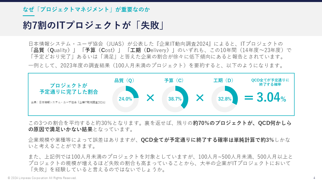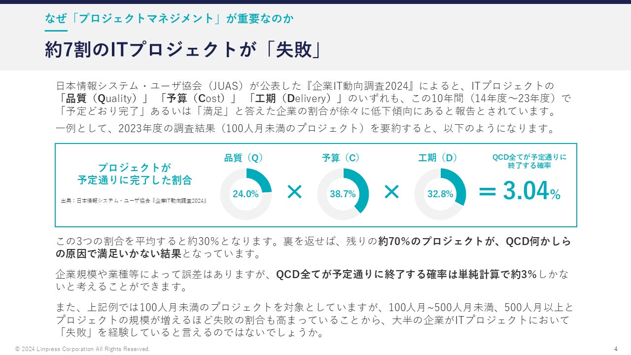 ITプロジェクトの「品質(Quality)」 「予算(Cost)」 「工期(Delivery)」のいずれも、この10年間(14年度~23年度)で「予定どおり完了」あるいは「満足」と答えた企業の割合が徐々に低下傾向にあると報告とされています。