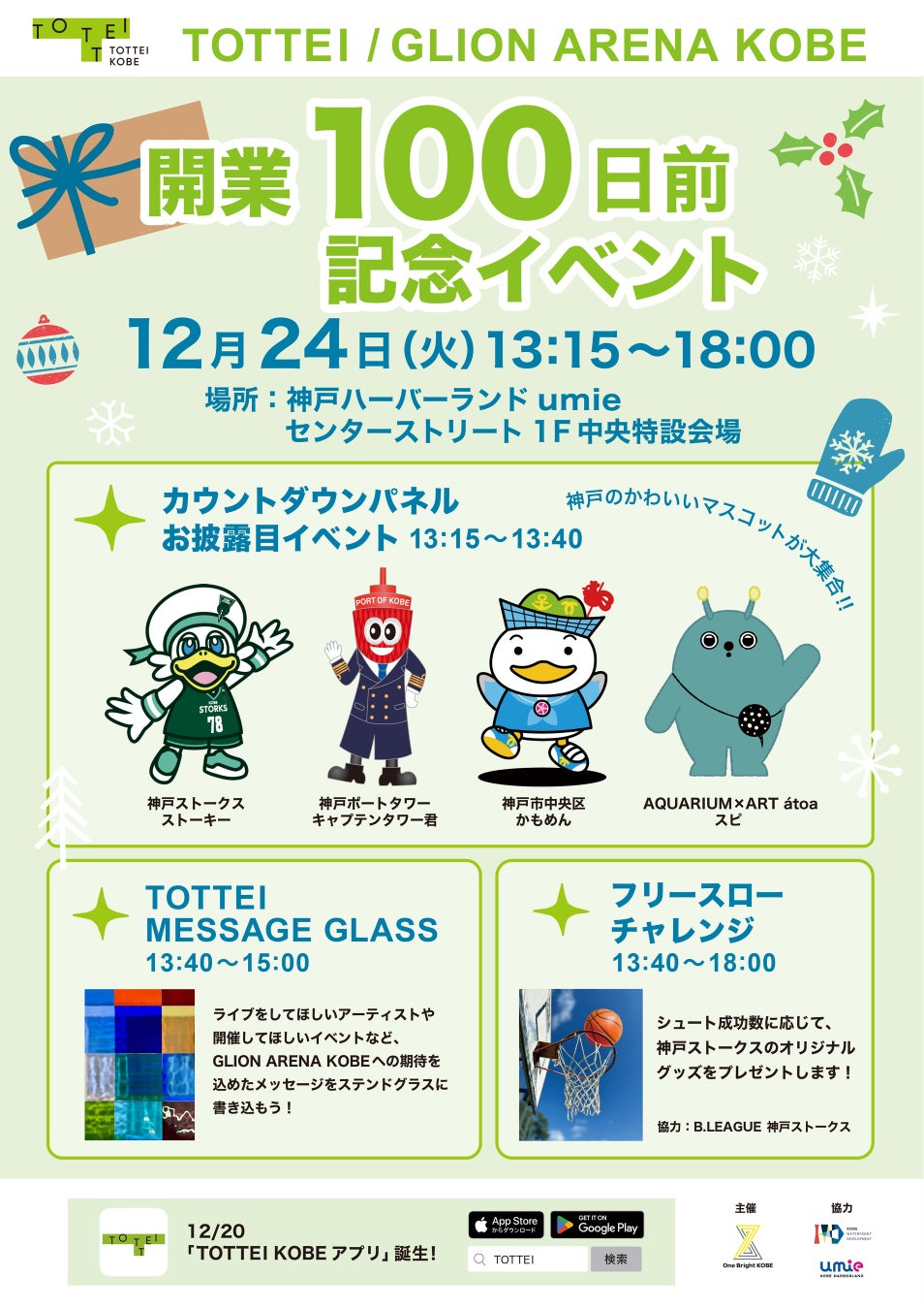 開業100日前を記念し、12月24日(火)より神戸ハーバーランドumieとJR元町駅前の2箇所にカウントダウンパネルが登場します。神戸ハーバーランドumieでは、カウントダウンパネルのお披露目に神戸を代表するマスコット達が来場し、開業100日前をお祝いします。また、「神戸ハイカラクリスマス」連動イベントとして、TOTTEI開業に向けた期待メッセージを書いてステンドグラスアートを彩る参加型イベントやバスケットボールのシュートチャレンジを開催します。