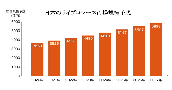 ライブコマースは、日本でも、成長が見込まれる市場として注目を集めています。ライブコマース市場規模の2027年の最大値予想は、5,893億円と見込んでいます。※