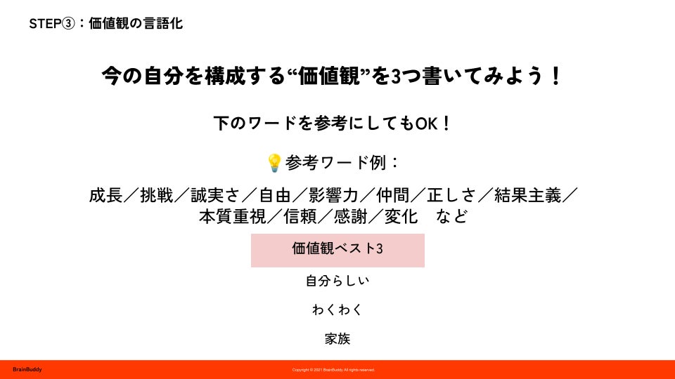 続いて、その経験の深掘りを行いました。ここで「なぜ?」を繰り返しながら、具体のエピソードを段々と抽象化し、自分の価値観を見つけていきます。