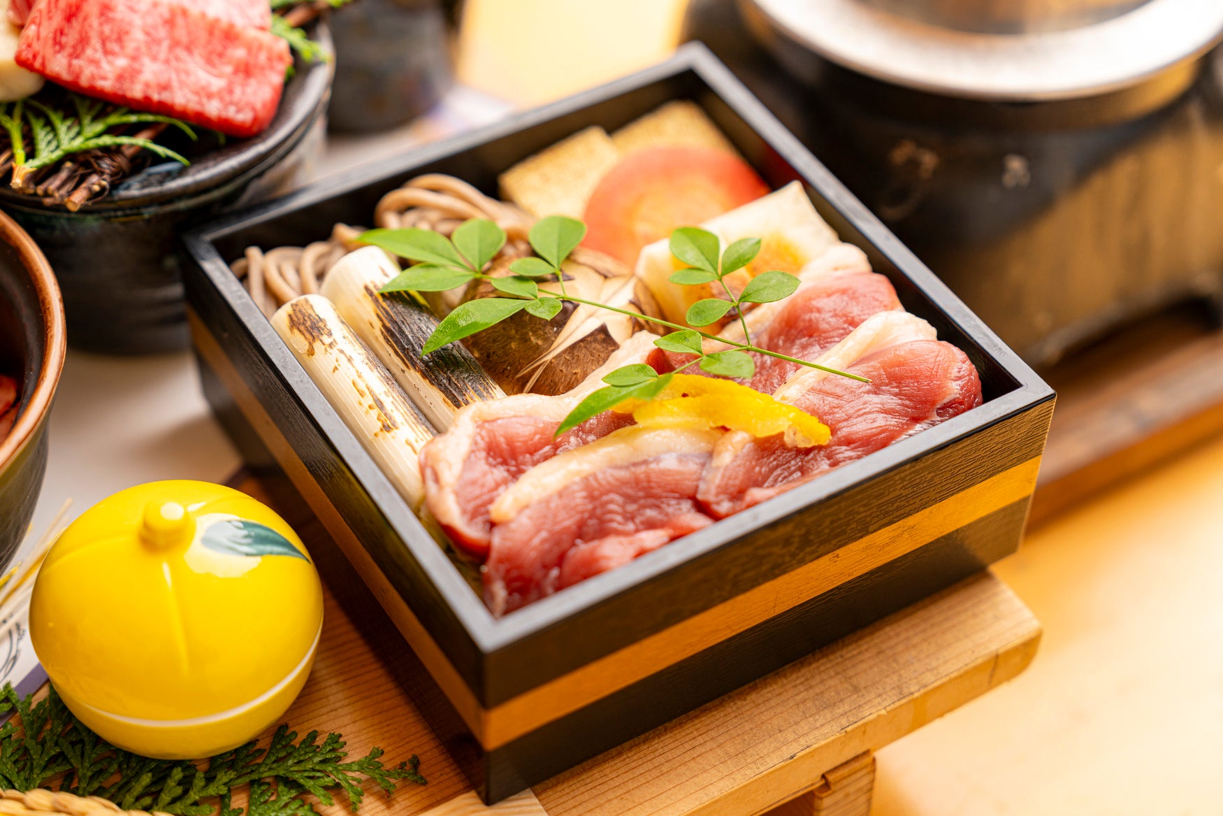 五穀豊穣のお茶屋ごはん®︎ 五木茶屋 先斗町店では、お好みに合わせて「鴨ロースと冬野菜のすき焼き鍋」か「和牛肩ロースと冬野菜のすき焼き鍋」のどちらかをお選び頂けます。