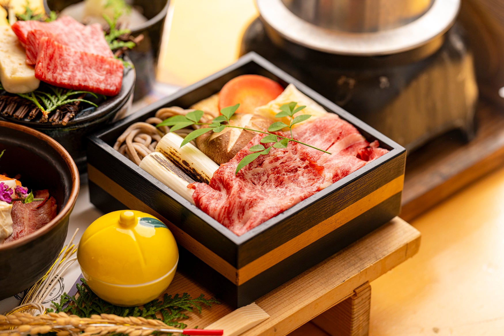 やわらかな和牛肩ロースと旬の冬野菜を上品な割り下で煮上げた贅沢なすき焼き鍋。