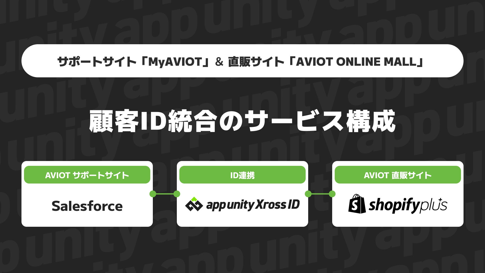 直販サイト「AVIOT ONLINE MALL」が採用するコマースプラットフォーム「Shopify」(最上位プラン「Shopify Plus( https://www.shopify.com/jp/plus )」を利用)に、「App Unity XrossID」を導入。