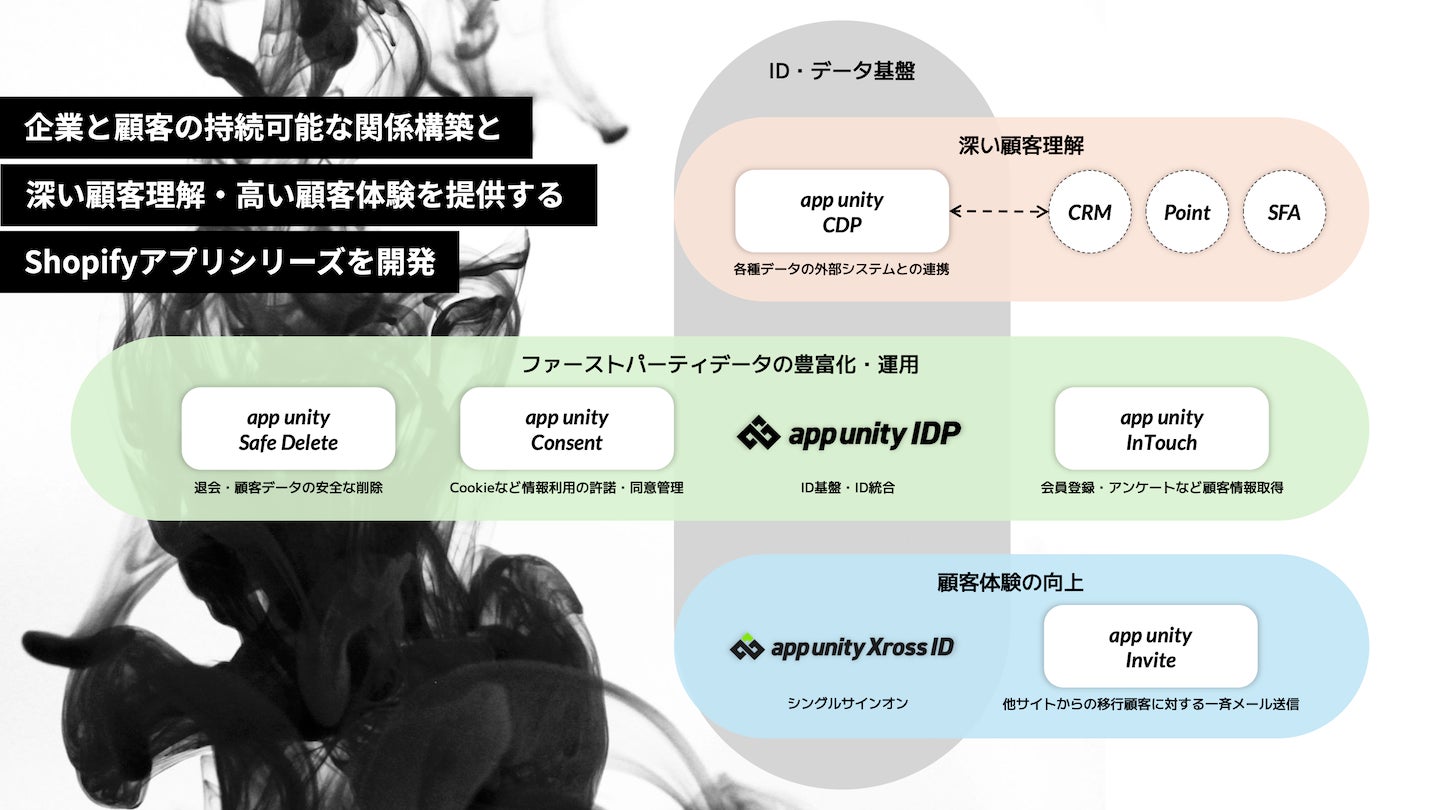 顧客情報・体験の中心にShopifyを据え、多極化する顧客接点を横断して、ログインID・ポイントの共通化や統合した顧客情報を元にマーケティングに関わる企画・施策実行ができるアプリシリーズの提供や、カスタムアプリの開発を支援しています。