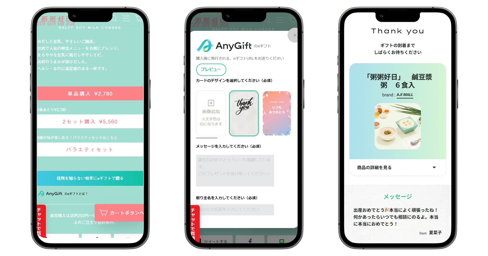 今回、当社のAnyGiftの提供により、「AJI MALL」にて「Dashi-Cha」や「粥粥好日」、「One All」といった、味の素社ならではの通販専用の商品をeギフトとして贈れるようになりました。