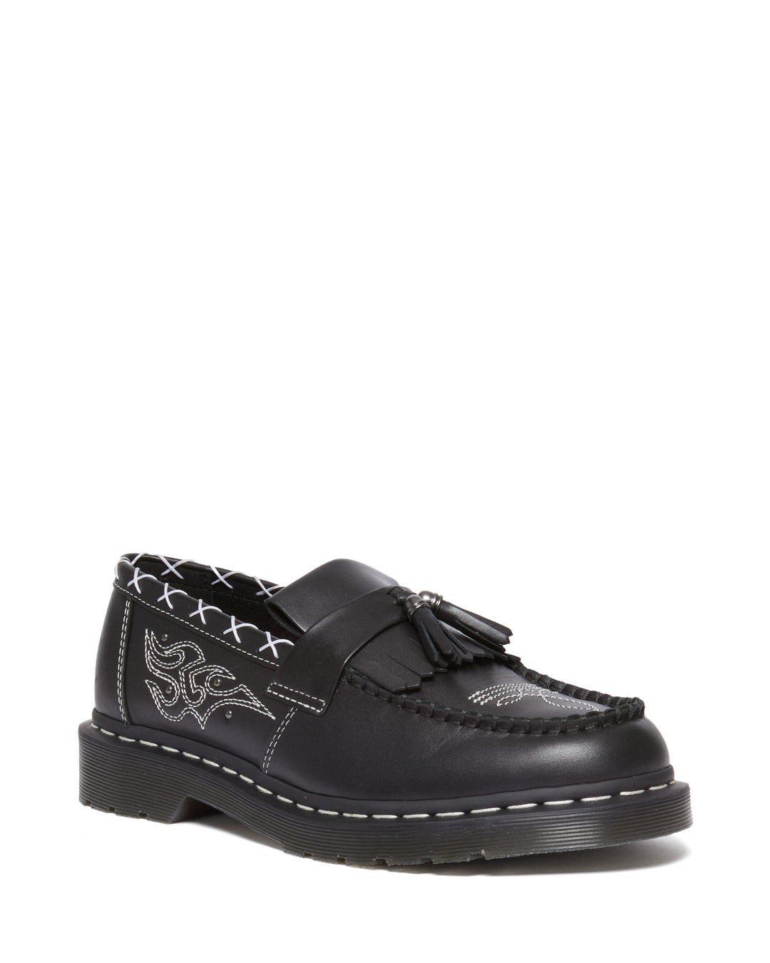 丈夫で軽く履き心地のよいブラックのワナマ・レザーを使用したスリッポンタイプのエイドリアン・ローファーには純白のステッチ刺繍を施し、シャープなコントラストを生み出しています。レザーのキルトフリンジとタッセルで仕上げています。
