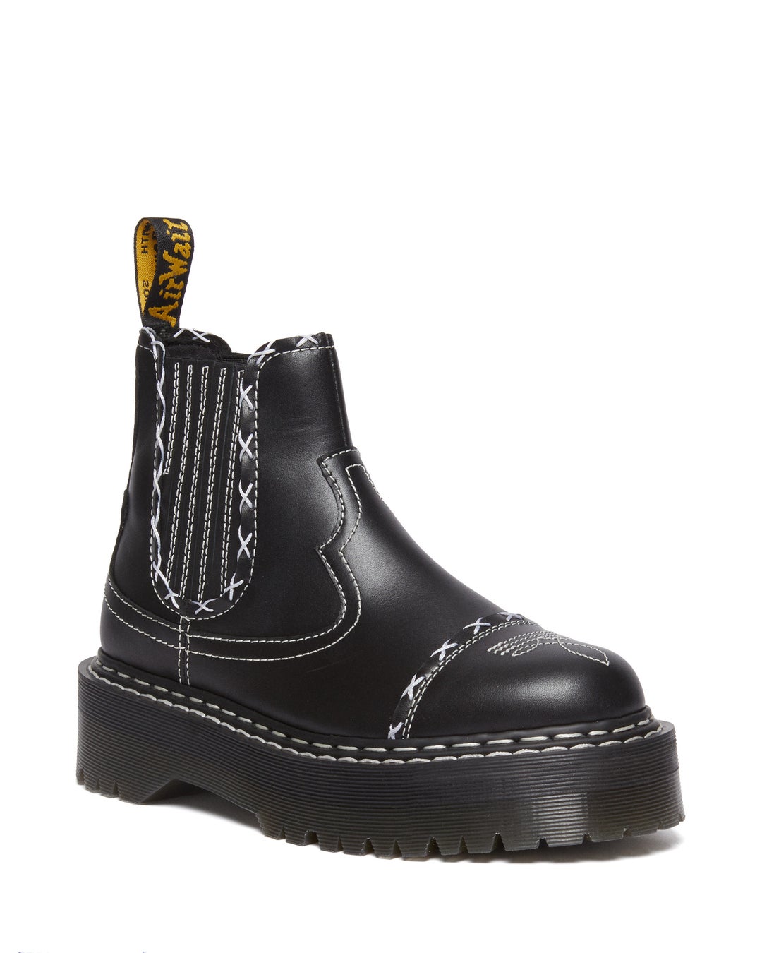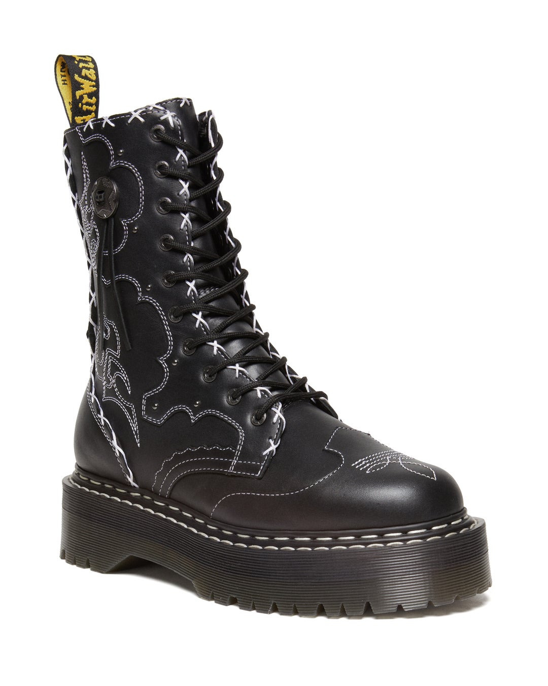 ブラックのワナマ・レザー製で高さとパワーを強調するクワッドソールを搭載しています。クロスステッチの縁取りとボロネクタイからインスパイアされたコンチョがアクセントを添えます。インナーアンクルジップとドクターマーチンの印象的なAirWairヒールループで仕上げました。