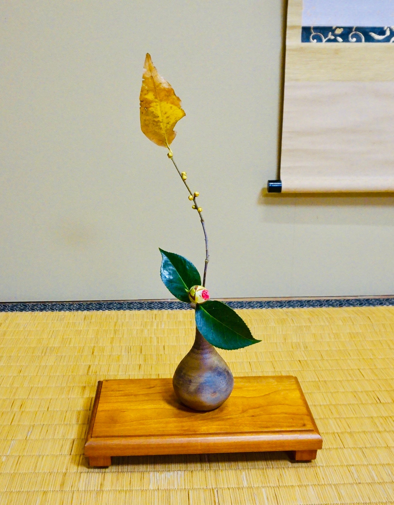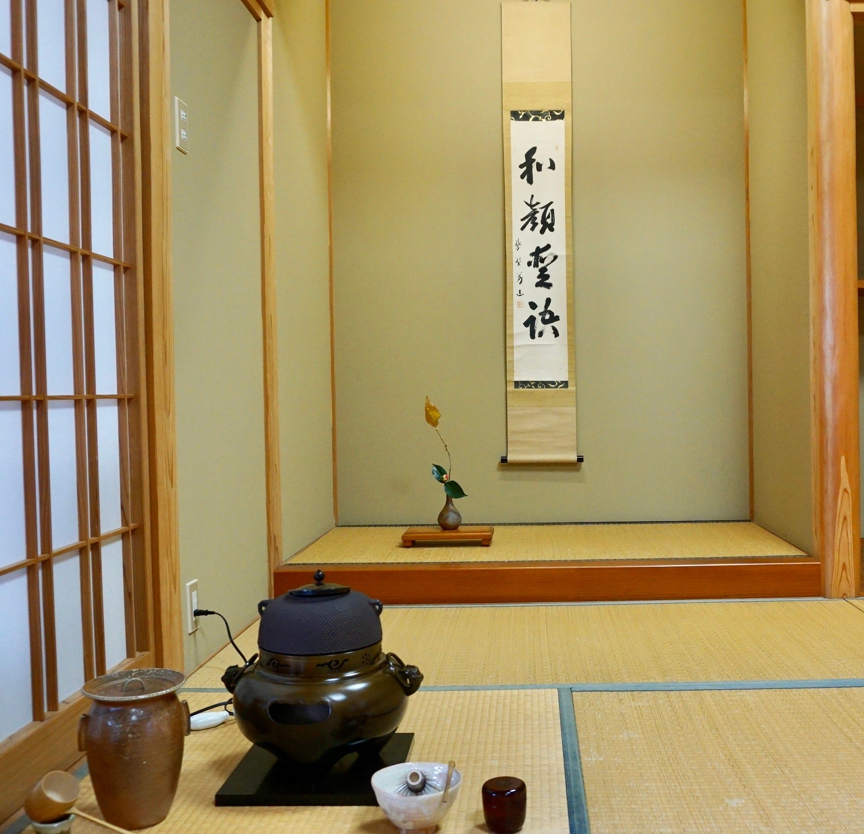 次に品川さんの流れるような美しい所作を見ながら、茶室の佇まいを観察します。床の間には「和顔愛語」と書かれた掛け軸と小さな蕾をつけた藪椿と一枚の葉だけの蝋梅。 シューンという湯の煮え立つ音と微かに揺らめく白い湯気が、癒しの空間を作っています。