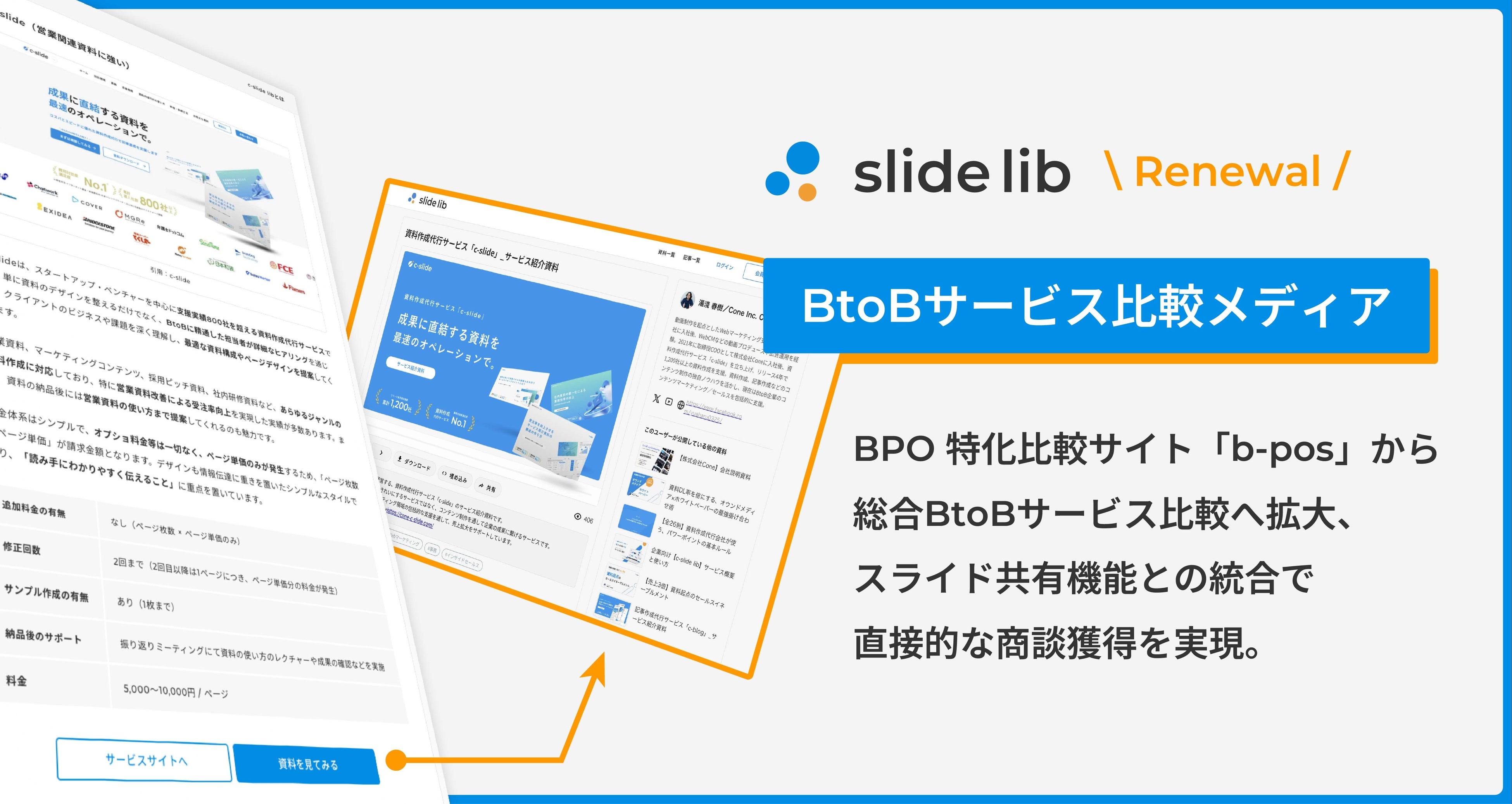 そこで、当社が2025年11月にリリースしたBtoBスライド共有サービス「c-slide lib」と、b-posの持つ比較記事メディアを統合し、BPOに限らずあらゆるBtoBサービスを扱う資料掲載ポータルサイト「slide lib」としてリニューアルする運びとなりました。