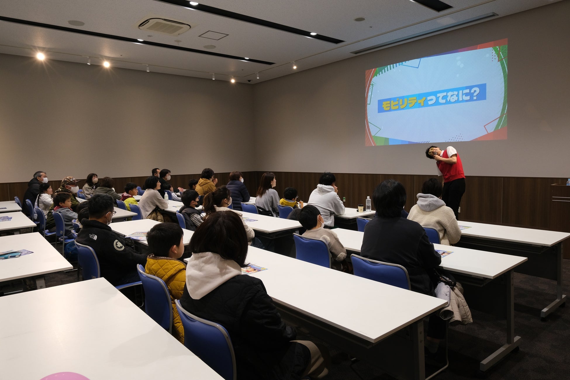 本イベントでは、キッズウィークエンドでもリピートの絶えない人気講師である数学教師芸人のタカタ先生を講師に迎え、モビリティの未来について親子で楽しく学べる機会を提供。前半は車の歴史や未来を変える最新技術について楽しみながら学ぶことで、モビリティへの理解と興味を深めました。