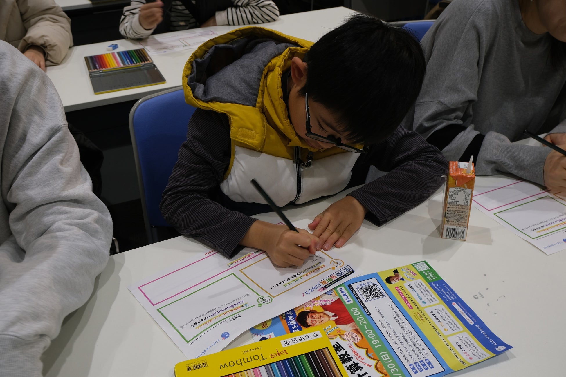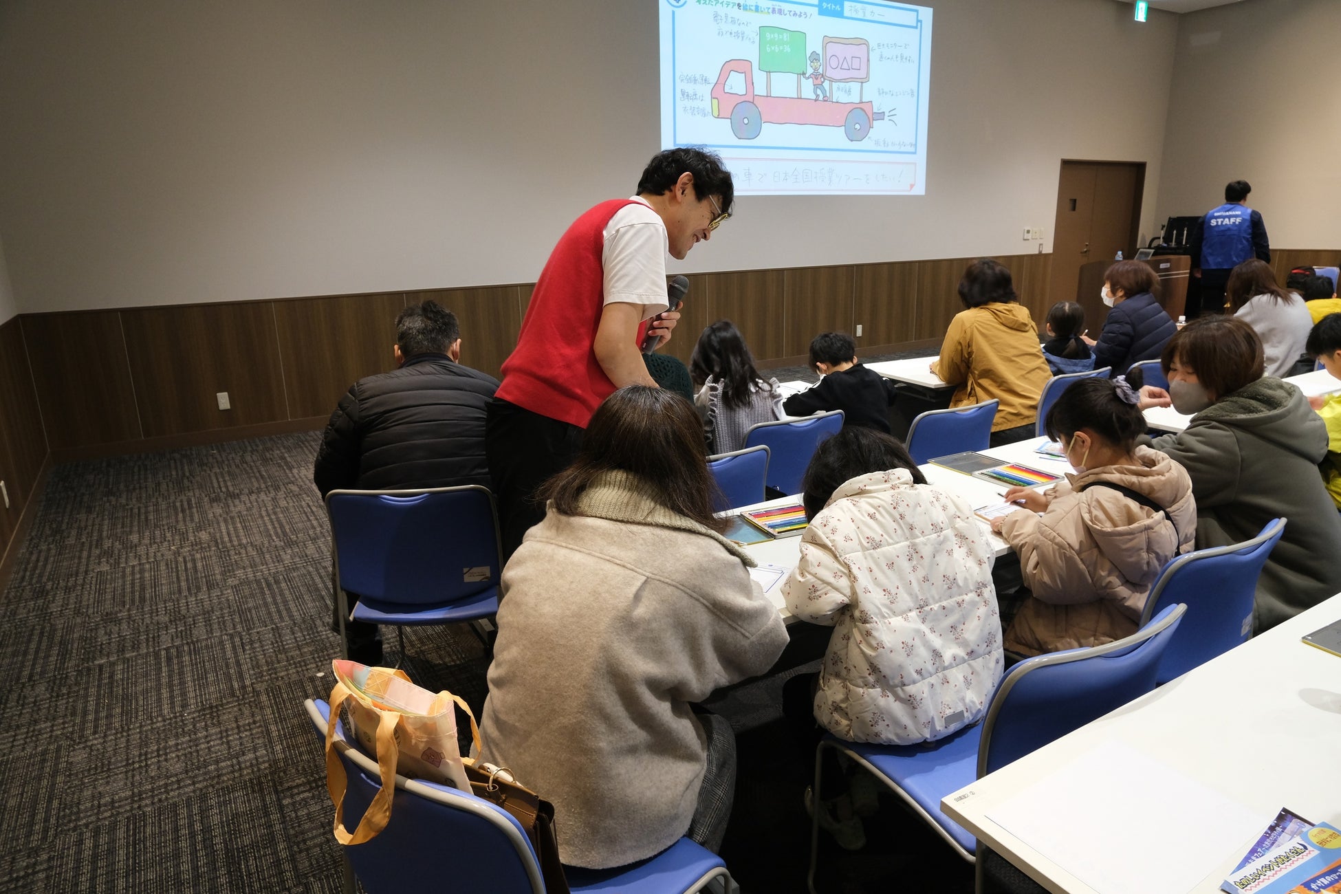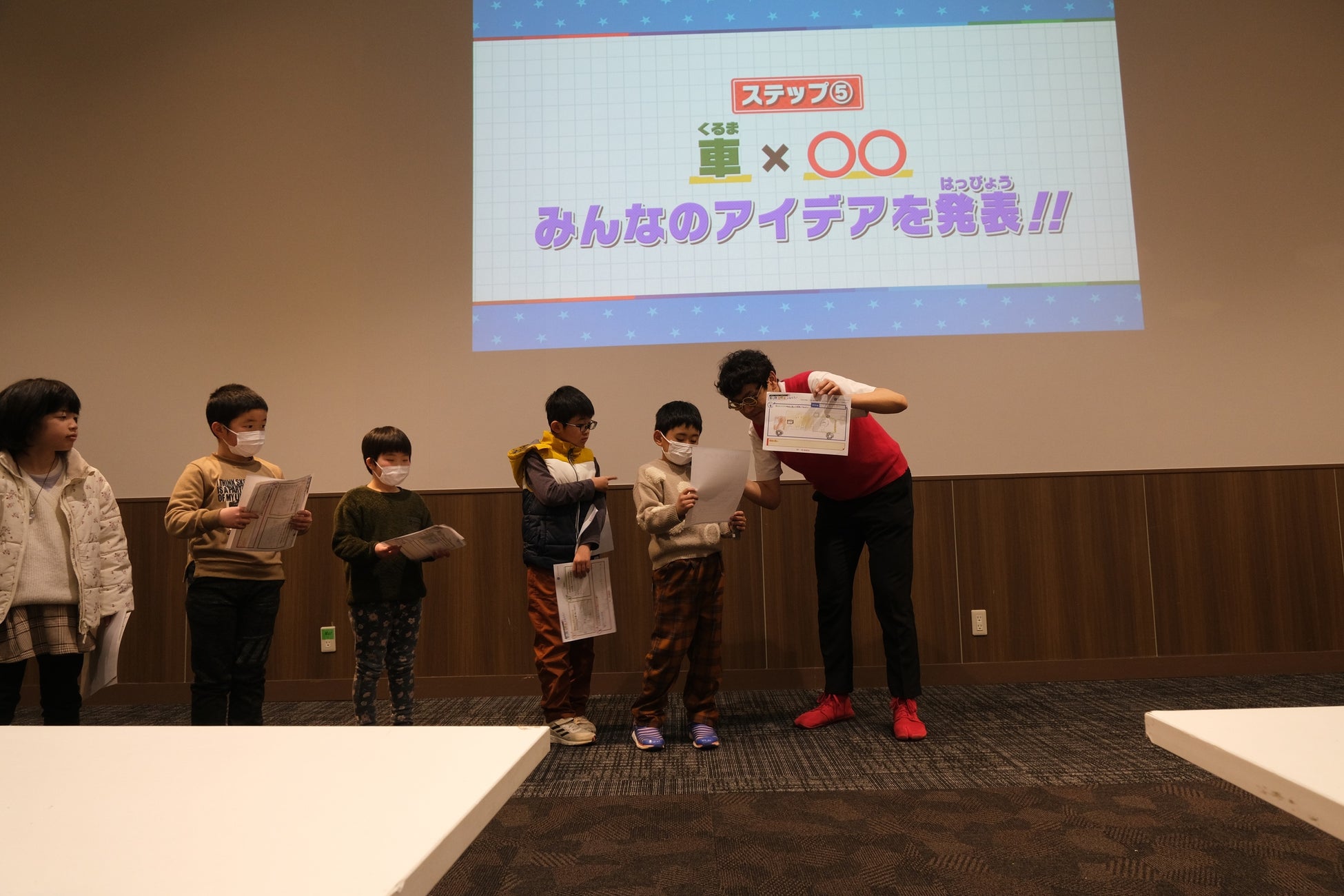 後半は「未来の乗り物」をテーマに、4ステップのプロセスを用いて「考える力」を育成するプログラムを展開。子どもたちが自由な発想で自ら創造したアイデアを絵に描き、最後はお互いに発表する時間が設けられました。