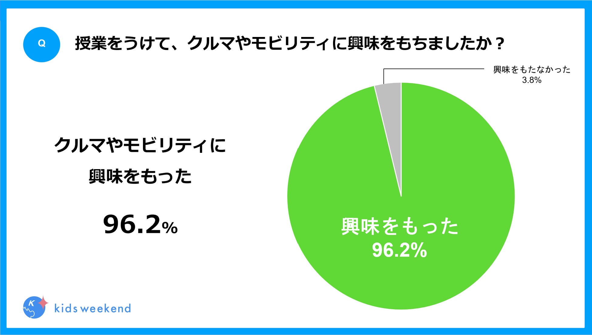 「クルマはすきですか?」という問いに36.5%が「ふつう」と回答していたのに対し、授業を受け96.2%が「クルマやモビリティに興味を持った」と回答。更に「将来クルマにかかわる仕事をしてみたいと思った」と回答した人が90.4%という結果になり、車に対する理解を深めることで、子どもたちの新たな興味を引き出すことに成功しました。