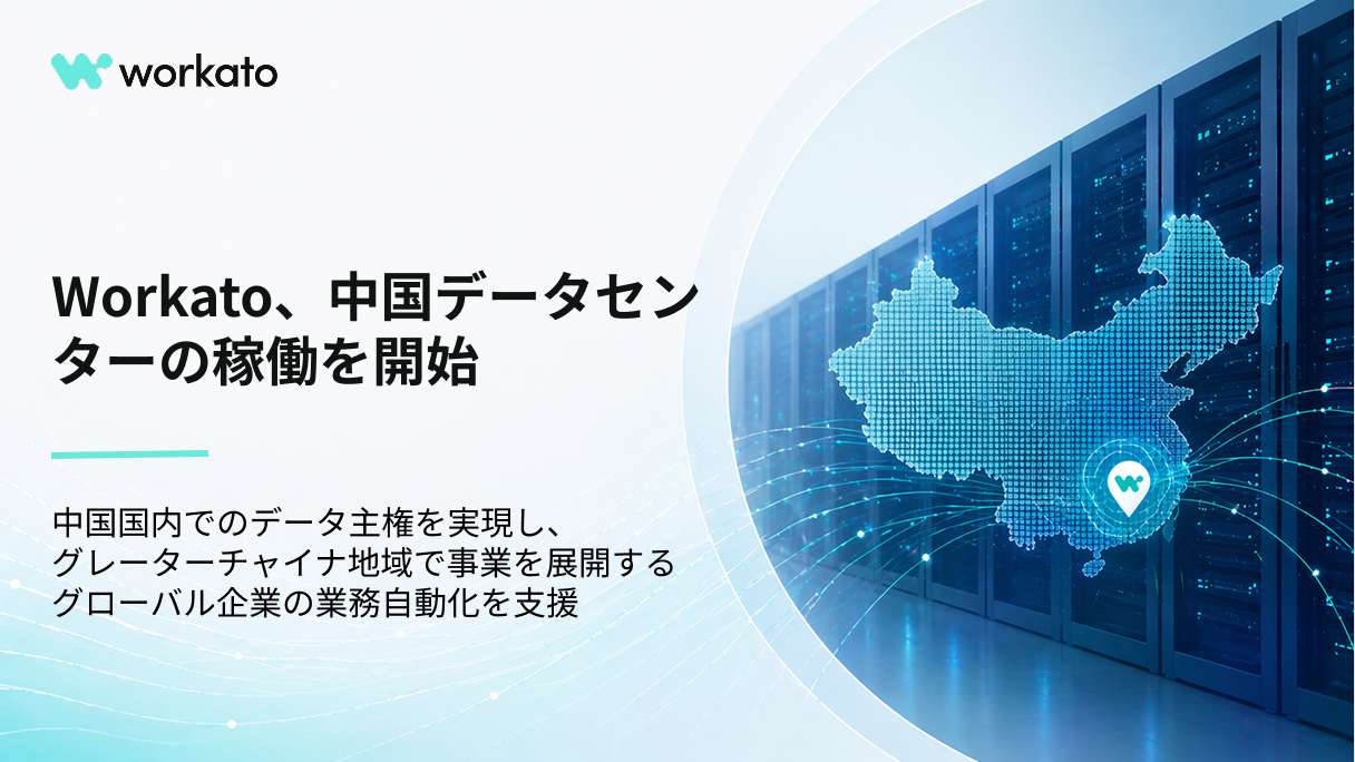 中国は、世界で最も複雑かつ最も重要な市場のひとつです。中国データセンターの稼働により、グローバル企業は中国国内でWorkatoをネイティブに運用できるようになります。すべてのデータは中国国内に保持され、コンプライアンス要件を満たしながら、中国・日本・米国・欧州などのいずれの拠点においても、同一のレシピ・コネクタ・アクセラレータを用いた統一された自動化基盤をご利用いただけます。