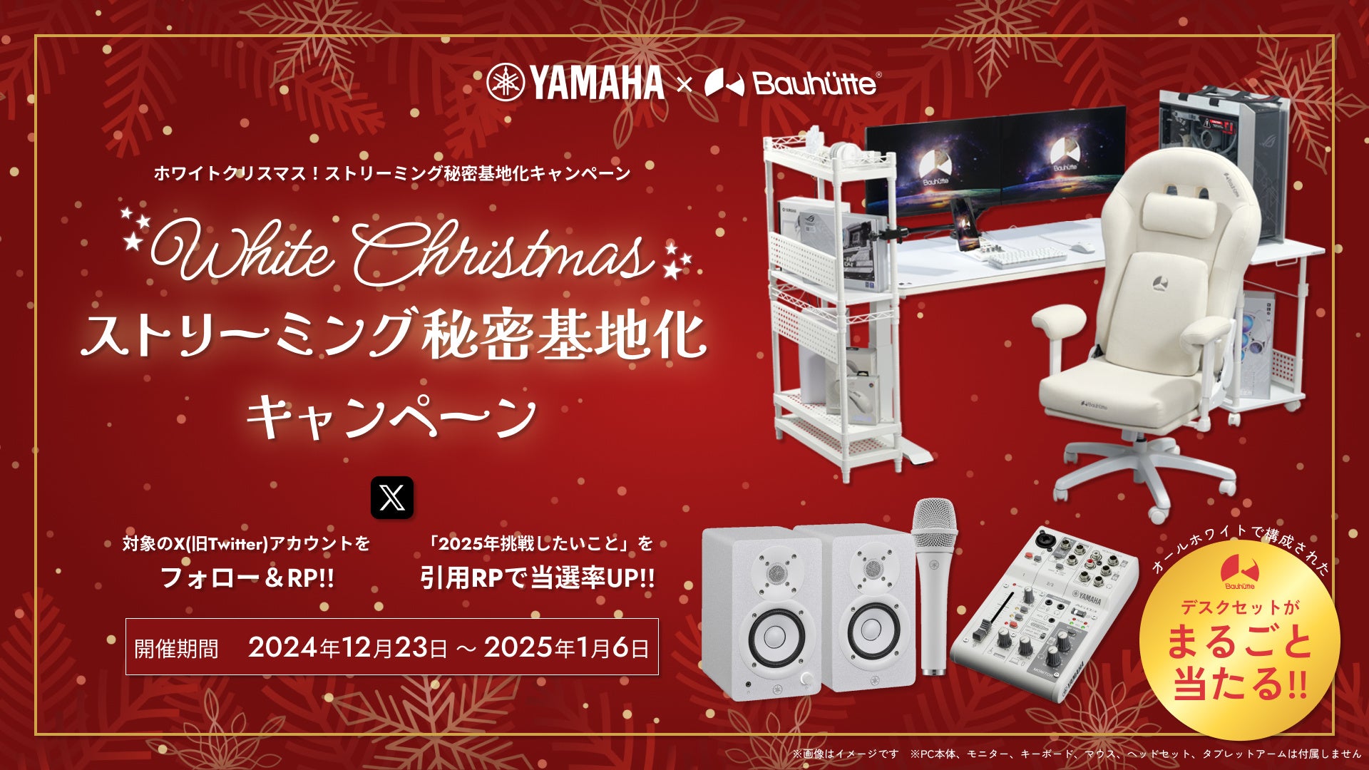 弊社ゲーミング家具ブランド「Bauhutte(R)(バウヒュッテ)」は2024年12月、Xアカウントのフォロー&リポストでホワイトクリスマスをイメージした配信デスクセットがまるごと当たる「YAMAHA×Bauhutte ホワイトクリスマス!ストリーミング秘密基地化キャンペーン」を開催いたします。