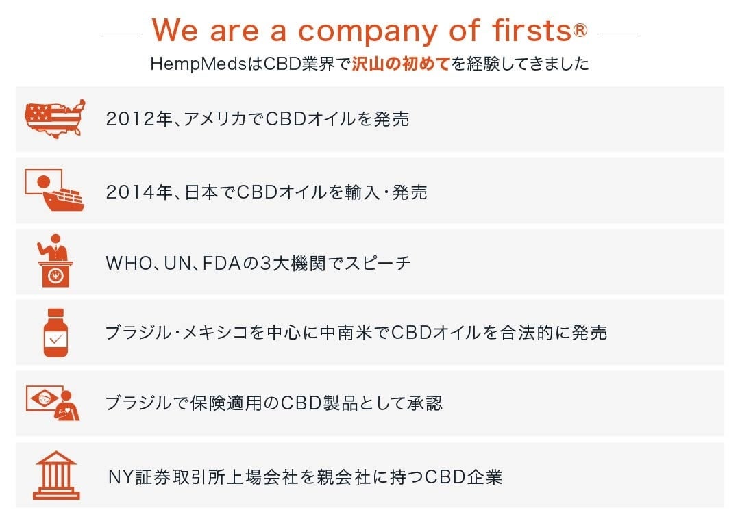HempMedsは「Your Trusted CBD(信頼できるCBDを)」と「We are the first®(私たちは初めての会社です)」をコンセプトに、2012年にアメリカ史上初めてCBDオイルを発売したCBDのブランドです。40以上の国と地域での販売、研究開発費は延べ100億円超、ブラジルやメキシコでは医療現場でも活躍しています。
