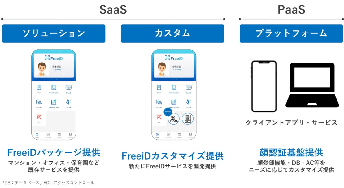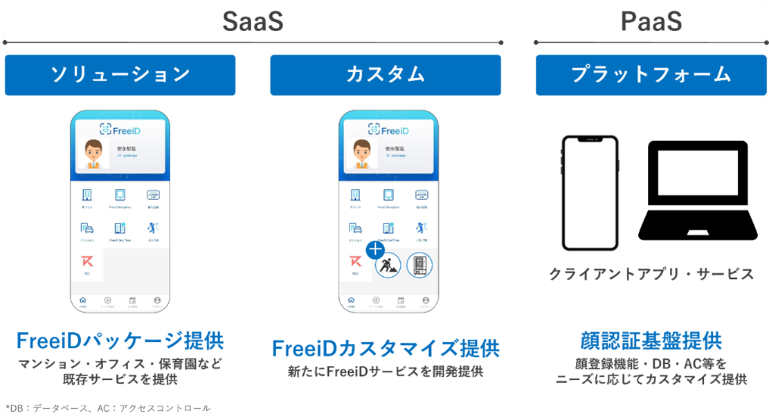 マンション・オフィス・保育園などFreeiDのパッケージサービスを提供する「ソリューション」、顧客ニーズによりFreeiD・顔認証サービスをカスタマイズする「カスタム」、顧客アプリやサービスに顔登録・保存・認証等の顔認証基盤を提供する「プラットフォーム」の3事業を展開しています。