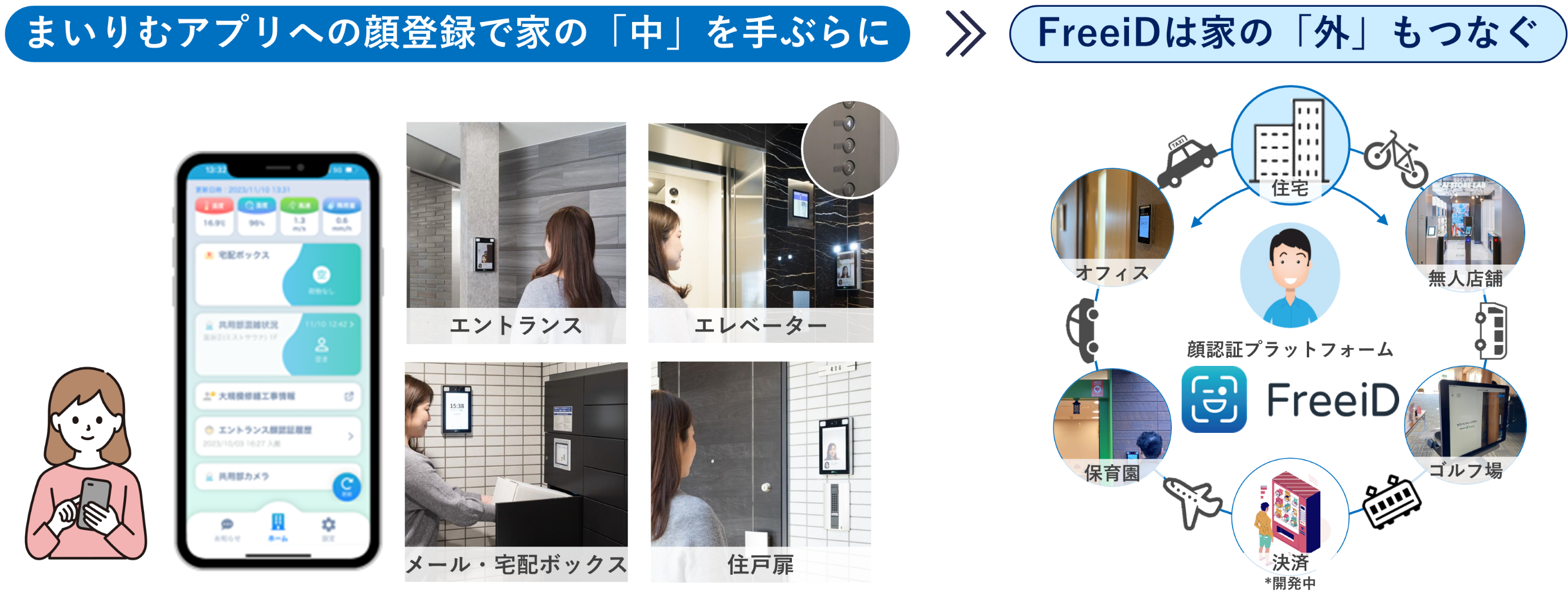 一方、DXYZが開発・提供する「FreeiD」は、鍵や財布・スマホを持つことなく、1度の顔登録で『顔ダケで、世界がつながる。』顔認証プラットフォームです。住宅領域では、国内初※1の鍵が一切不要となる「オール顔認証マンション」を実現し、2021年1月以降36棟(2023年11月末時点)に導入しております。