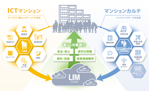 長谷工では、「ICTマンション」に設置した認証設備や各種センサー等によって得られた住まう方のライフログや、「マンションカルテ」に登録された建物・設備のメンテナンスデータなどを活用し、暮らしを最適化する概念を「LIM(Living Information Modeling)」と呼んでいます。そして、それらのデータを収集・分析するプラットフォーム「LIM Cloud」を開発しています。※3