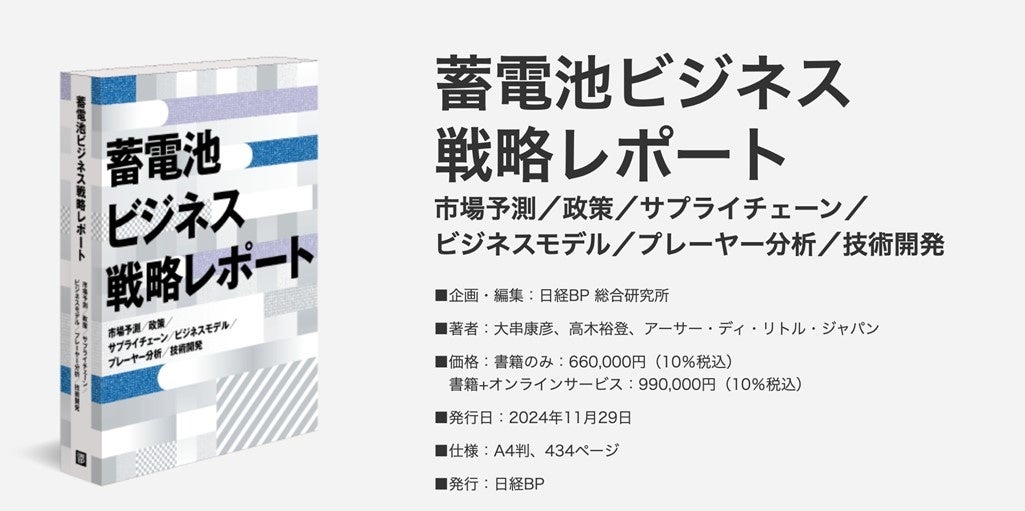 アーサー・ディ・リトル・ジャパン株式会社(本社:東京都港区、マネージングパートナー・日本代表:原田 裕介、以下「ADL」)は、蓄電池ビジネスへの投資を検討する企業及び、蓄電池ビジネスへの参入を検討する企業向けに日経BP 総合研究所が企画・編集し、2024年11月29日に日経BPが発行した「蓄電池ビジネス戦略レポート」の第2章に、弊社コンサルタントが寄稿したことを発表いたします。