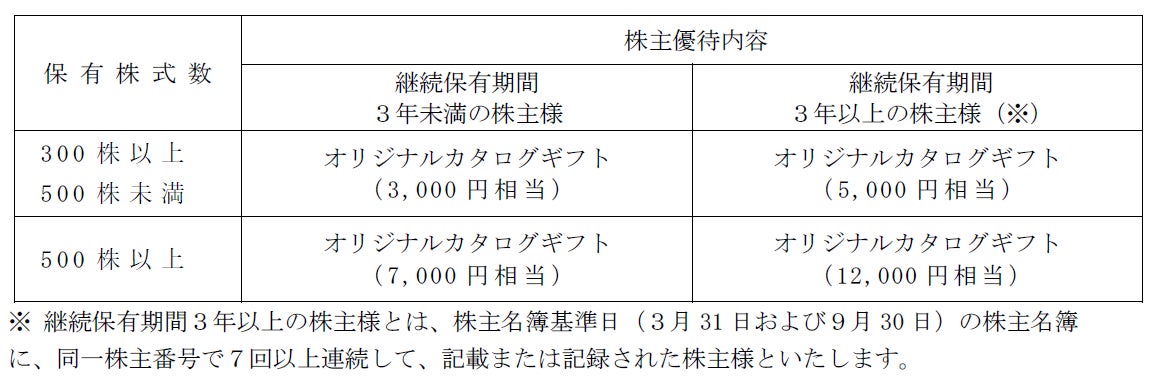 毎年3月31日現在の株主名簿に記載または記録された、当社株式を300株(3単元)以上保有されている株主様を対象といたします。