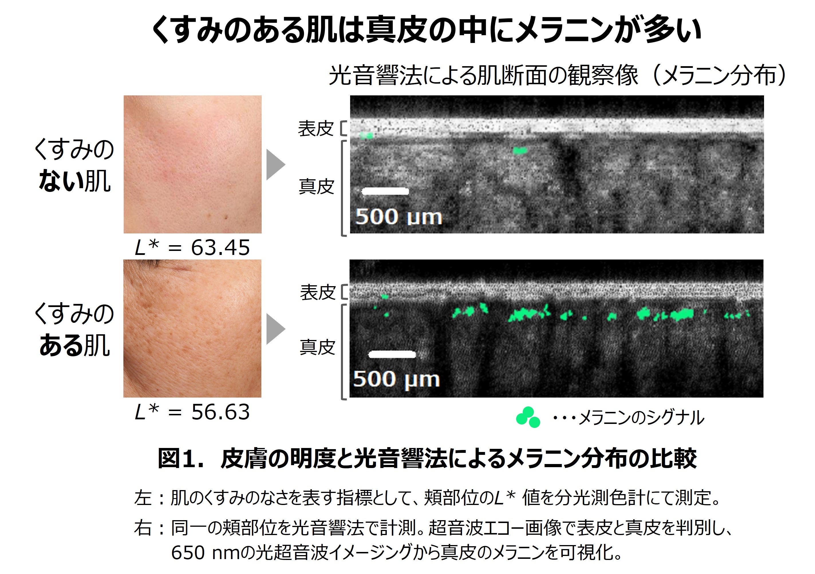 本研究では新たに光音響法(補足資料1)を用いて真皮中のメラニンを可視化しました。この方法で分析した結果、くすみのある肌では真皮メラニンが多く、肌のくすみには真皮メラニンの影響も無視できないことを明らかにしました(図1、補足資料2)。