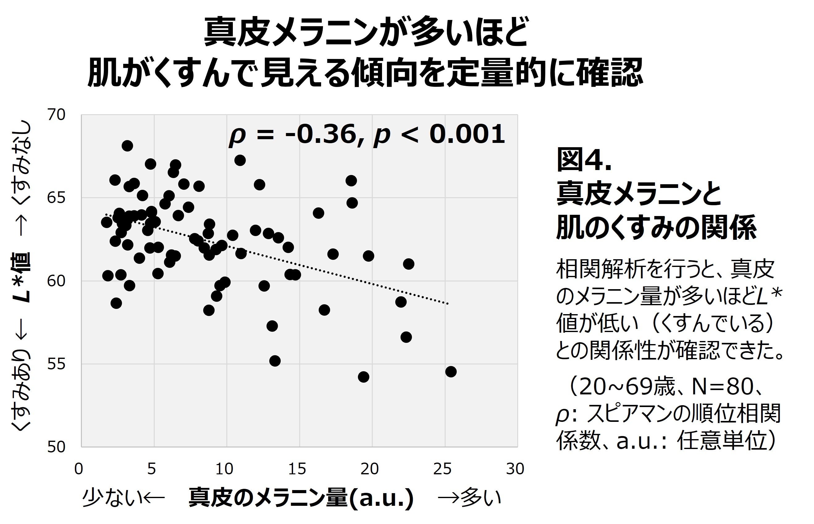 20歳から69歳までの女性80名にご協力いただき、光音響法を用いて頬部位の真皮のメラニンを定量し、同じ部位のL*値との関係性を調べました。その結果、真皮のメラニン量が多いほど肌がくすんでいる(L*値が低い)傾向が明らかになり、真皮中のメラニンの蓄積が肌のくすみに影響することが定量的に示されました(図4)。