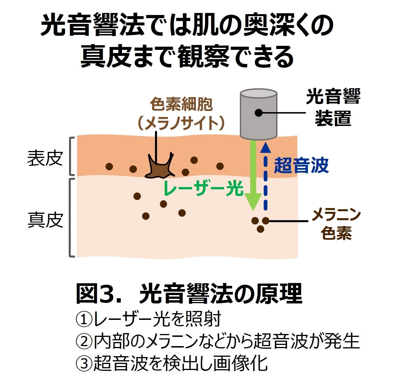 近年開発された光音響法では、メラニンなどの構成物が特定の波長の光を吸収し超音波を発することを利用して肌内部を観察できます(図3)。
