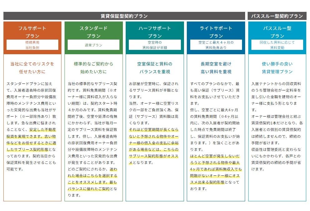 以上を反映させたアットクリニックのサブリースプランでは、過不足なくニーズを満たすためさらに細分化した5種類のプランをご用意いたしました!