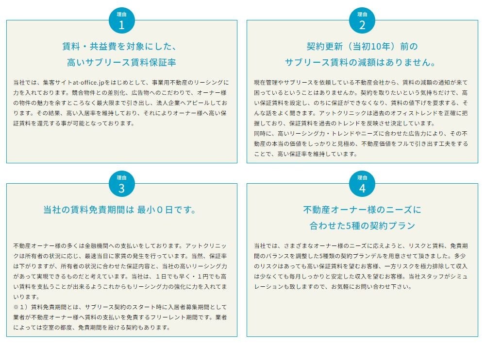 そんな信頼と実績のアットクリニックがお届けするサブリースサービス、自信を持ってご紹介できるのは以下のサービス内容が理由です!